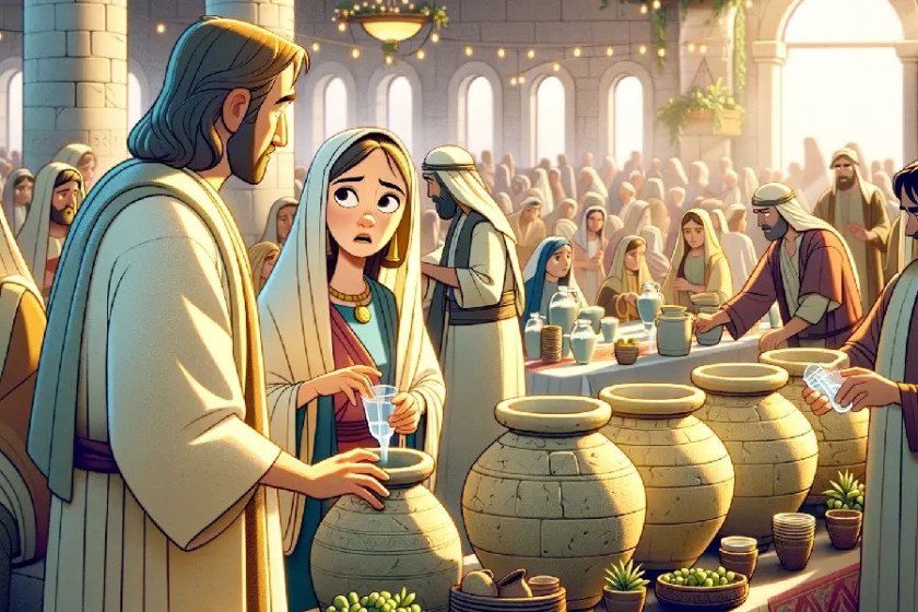 John 2:1-11. 1On the third day there was a wedding at Cana in Galilee, and the mother of Jesus was there. 2Jesus also was invited to the wedding with his disciples. 3When the wine ran out, the mother of Jesus said to him, “They have no wine.” 4And Jesus said to her, “Woman, what does this have to do with me? My hour has not yet come.” 5His mother said to the servants, “Do whatever he tells you.” 6Now there were six stone water jars there for the Jewish rites of purification, each holding twenty or thirty gallons. 7Jesus said to the servants, “Fill the jars with water.” And they filled them up to the brim. 8And he said to them, “Now draw some out and take it to the master of the feast.” So they took it. 9When the master of the feast tasted the water now become wine, and did not know where it came from (though the servants who had drawn the water knew), the master of the feast called the bridegroom 10and said to him, “Everyone serves the good wine first, and when people have drunk freely, then the poor wine. But you have kept the good wine until now.” 11This, the first of his signs, Jesus did at Cana in Galilee, and manifested his glory. And his disciples believed in him.
