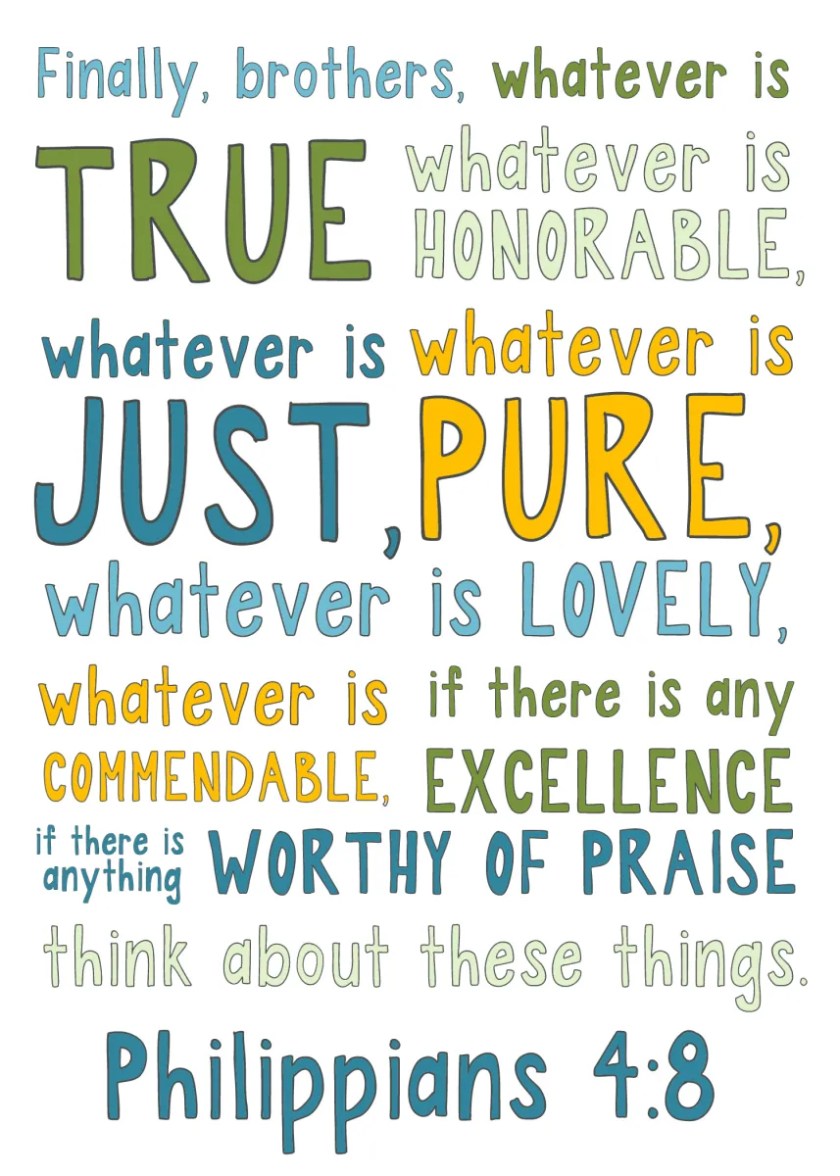Make Philippians 4:8 a family memory verse. How can we make sure that what goes INTO our minds matches these things that must be IN our minds – true, honorable, right, pure, lovely, admirable, excellent and worthy of praise?