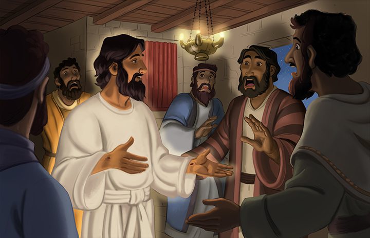 The two Emmaus travelers have made it back to Jerusalem and are exchanging “ghost stories” with the Twelve Disciples. We saw Jesus, did you see Jesus? The women have seen Jesus, so has Peter, and now these two. Could it be true that Jesus is alive?